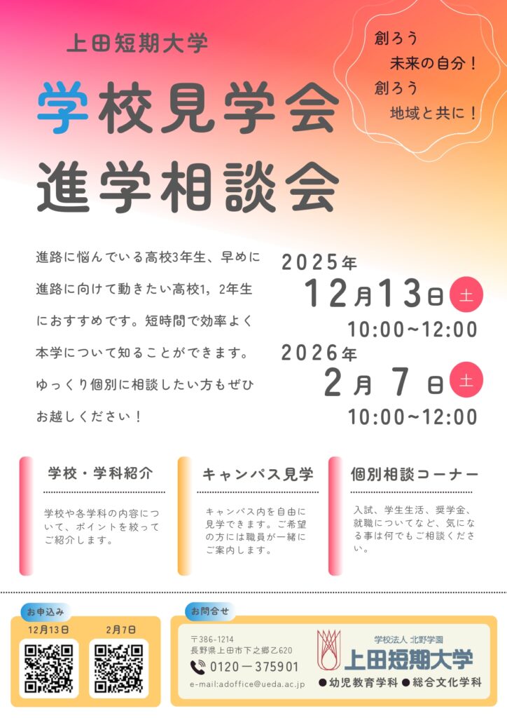 12月13日(土)に「学校見学会&進学相談会」を開催します。短時間で効率よく本学について知っていただけます。入試情報、進路情報、免許・資格、奨学金、アパート情報などの個別相談も可能です。進路に悩んでいる高校3年生、短時間の見学ならちょっと聞いてみたい、という高校1,2年生も大歓迎です!是非ご参加ください!